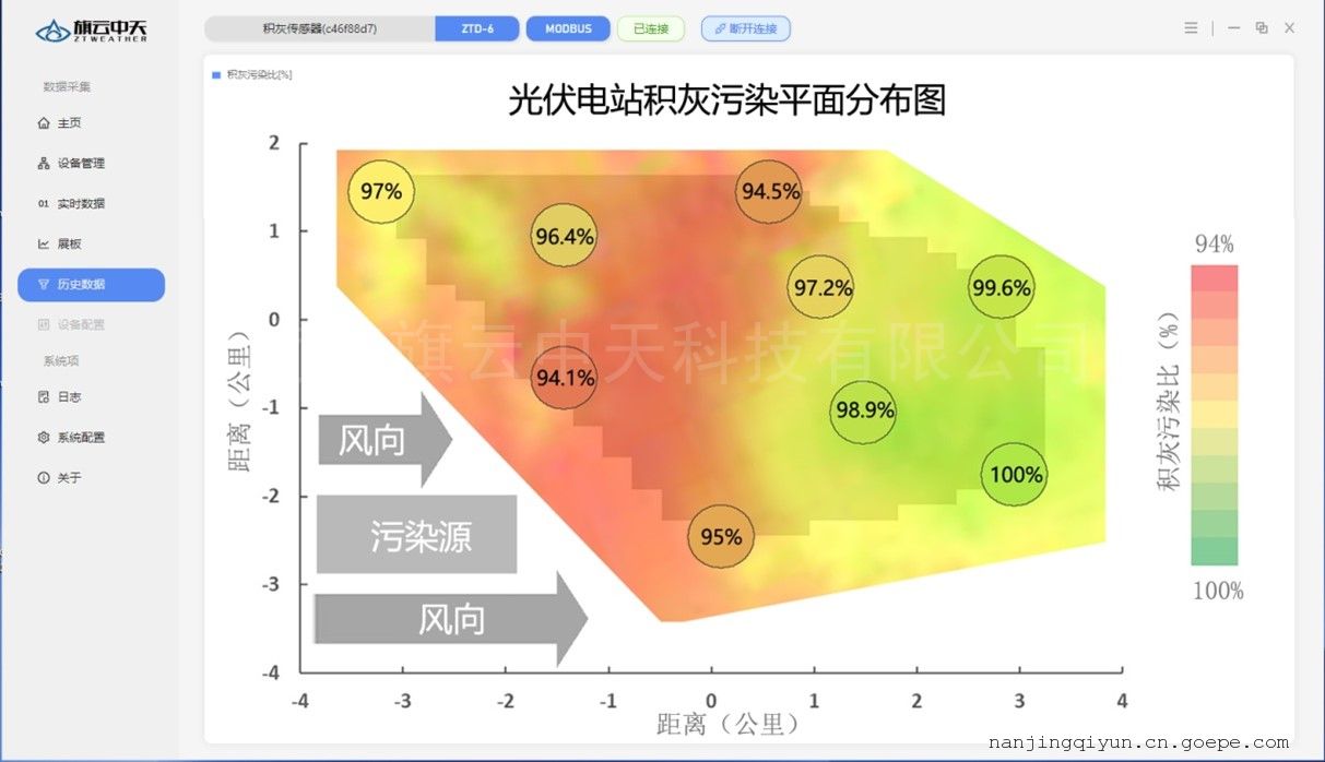 旗云中天自主研发的ZTD系列光伏组件积灰传感器及监测系统,可实现全天候在线测量光伏组件积灰污染比具有性价比高,稳定性好、体积小、部署灵活等优点、可为光伏智能化运维制定高效、低成本、高适应性的清洗方案提供数据底座,有效提升光伏电站运维效率和光功率预报的精度。
