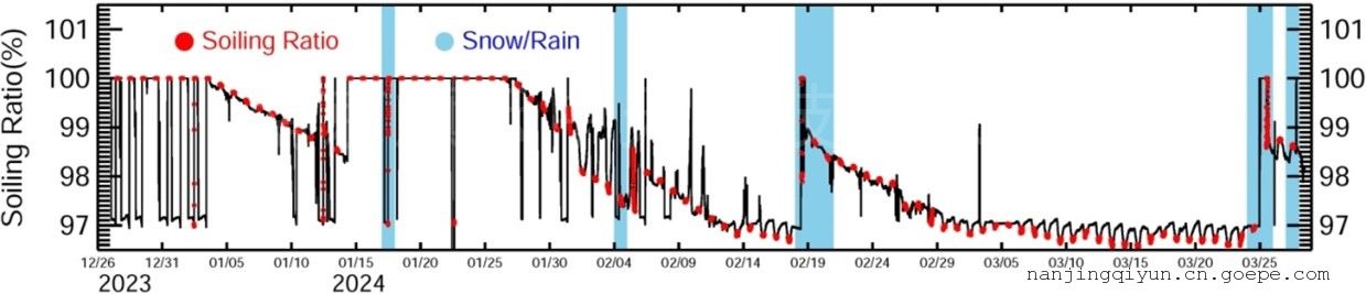 一次积灰过程:2024年1月4日至1月13日,即9天左右的时间,积灰污染比由100%下降至98.4%,积灰损失达1.6%;