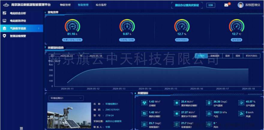 此外,配套的动态能效监测评估预警系统可实时监测评估组件发电能效,精准评估实际理论发电量、积灰损失电量,及时发布清洗预警,真正实现电站无人值守智能运维,满足行业光伏电站发电量、功率预测和智能运维的需求。