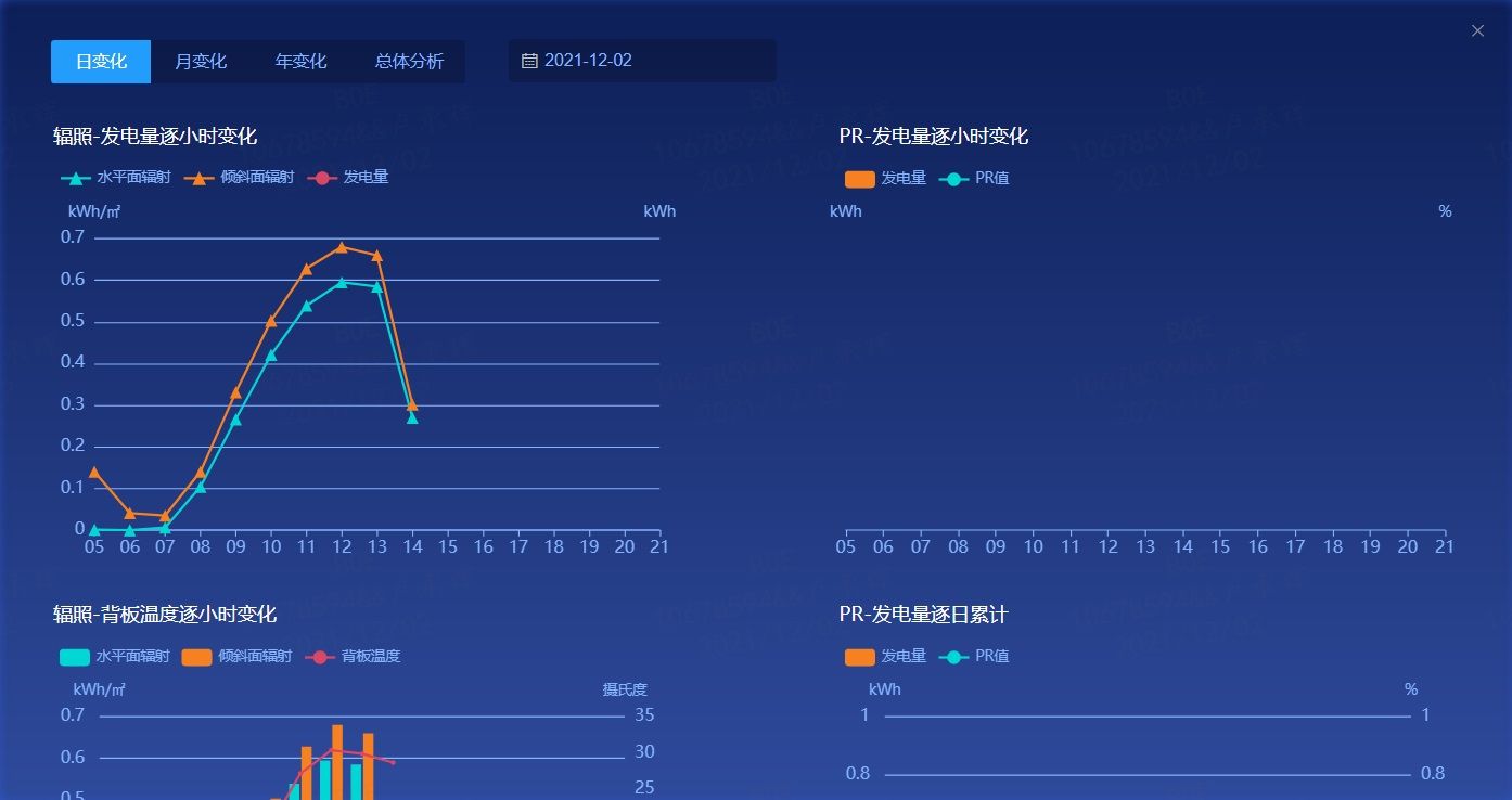 1、日分析:辐照-发电量逐小时变化、PR-发电量逐小时变化、辐射-背板温度逐小时变化、PR-发电量逐日累计、辐照-发电量逐小时累计、PR-发电量逐小时累计、辐照-背板温度逐小时累计。